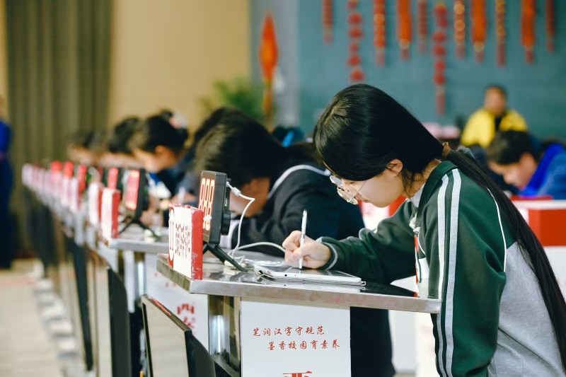 比賽環(huán)節(jié),小學(xué)組聚焦基礎(chǔ)漢字規(guī)范,選手們在田字格中認(rèn)真書寫,筆畫工整、結(jié)構(gòu)勻稱,稚嫩的筆觸中透著專注與認(rèn)真;初中組兼顧規(guī)范性與流暢性,選手們運筆穩(wěn)健,字跡清秀挺拔;高中組選手們筆墨酣暢、氣韻生動,在規(guī)范書寫的基礎(chǔ)上融入個人風(fēng)格,彰顯出青年學(xué)子的文化自信。選手們坐姿端正、握筆規(guī)范,專注于筆下的每一個漢字,從起筆、行筆到收筆,一絲不茍。評委團按照“規(guī)范、端正、整潔、美觀”的評分標(biāo)準(zhǔn),確保比賽公平公正。賽場內(nèi)墨香四溢,展現(xiàn)出一幅生動的漢字書寫畫卷。