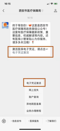 微信搜索“西安市醫療保障局”公眾號并關注,可根據歡迎語提示激活,也可點擊底部菜單欄激活: