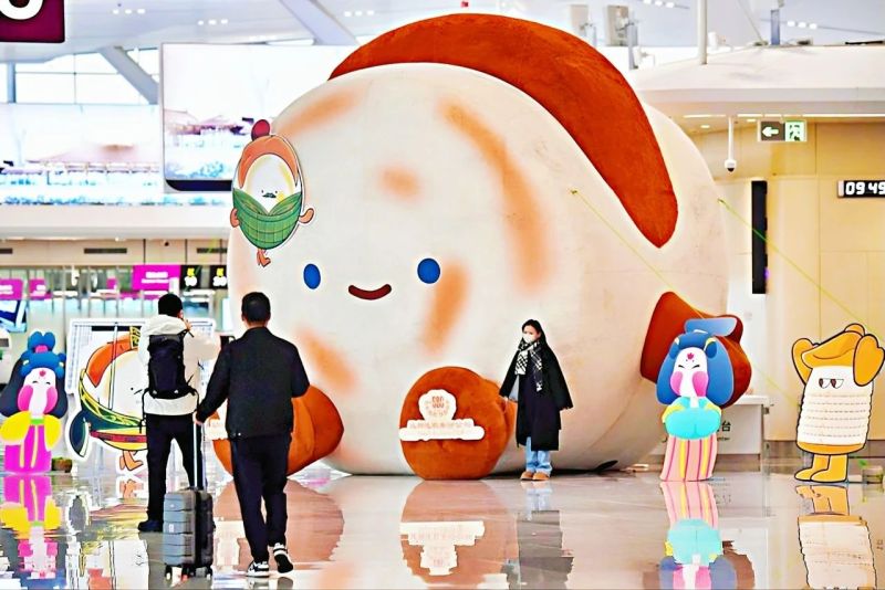 進入候機大廳,恢弘的氣勢撲面而來。陜西特色的“絨饃饃”和“秦嶺四寶”等IP形象隨處可見,展現了濃厚的本土文化氛圍。中央廣場的LED大屏滾動播放著陜西的歷史文化與旅游景點,讓旅客沉浸式感受三秦大地的魅力。
