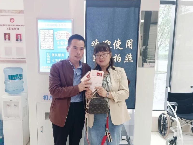 “整個效率非常高,程序也很簡單。很快就拍好了,而且登記處的工作人員也一直在引導我們,給我們教怎么操作。”4月23日,空港新城北杜街道的李廣會帶著妻子來到婚姻登記處申領結婚證,因為前幾天咨詢婚姻登記相關業務時了解到婚姻登記處有免費照相設備,兩人登記當天便好好收拾了一番,拍了一張兩人都滿意的結婚登記照。