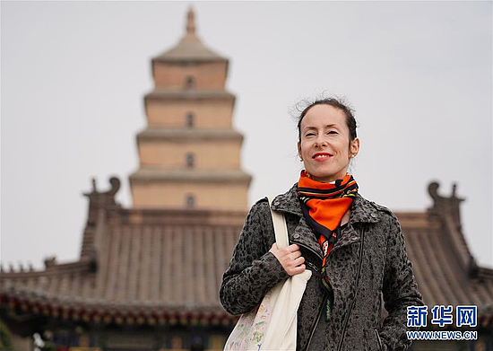 美珊在西安大雁塔南廣場散步(10月19日攝)。