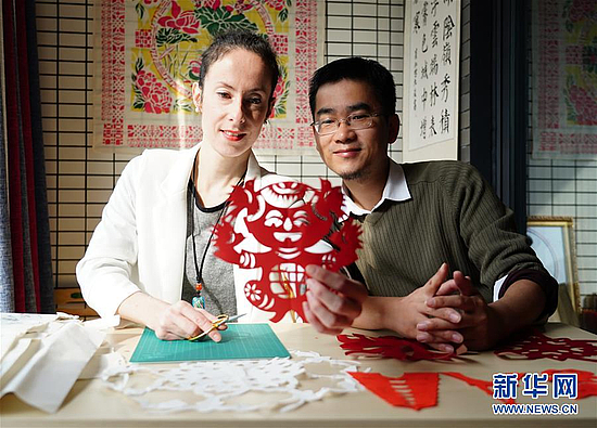 美珊是法國人,2004年與在法國圖盧茲留學(xué)的中國男生黃臻認識并相愛。2005年,黃臻回國工作,一年后畢業(yè)的美珊隨即來到上海工作。從2007年到2014年之陜西大學(xué)學(xué)習(xí)服裝設(shè)計專業(yè)的美珊在上海一家法國服裝公司做服裝設(shè)計。 2014年美珊與黃臻回到黃臻的老家西安,共同創(chuàng)立了臻美文化創(chuàng)意工作室。目前,他們從事插畫手繪、文創(chuàng)產(chǎn)品開發(fā)、自媒體等方面的工作,致力于宣傳中國傳統(tǒng)文化,促進中法文化交流。他們還原創(chuàng)推出了十余套以陜西非遺項目為主要內(nèi)容的表情包,完成了多本兒童雙語有聲讀物的策劃出版工作,并對多部中國電影、舞臺劇進行了法語字幕的編譯和推廣。 新華社記者邵瑞攝