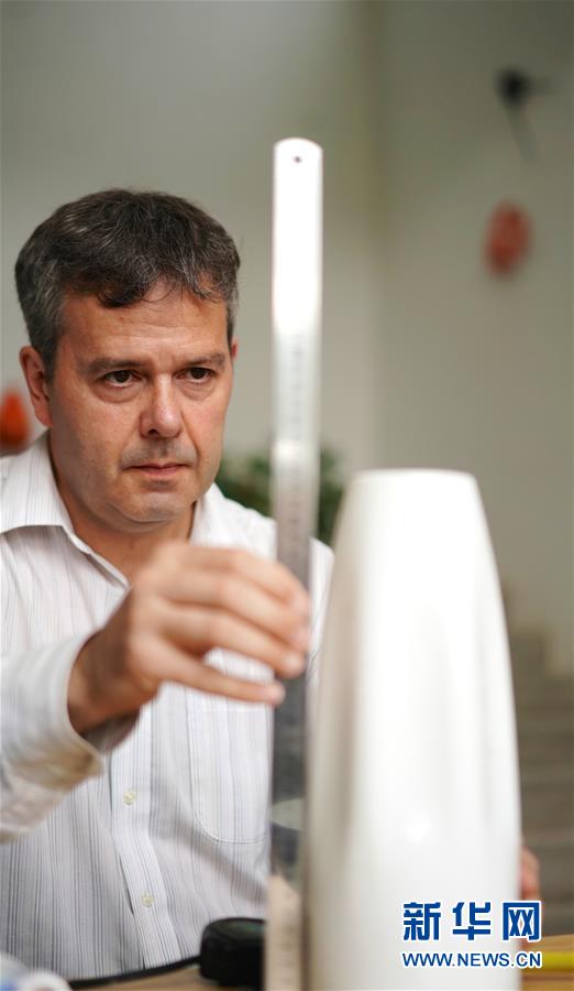 蓋博天在景德鎮(zhèn)的工作室測量新設(shè)計的陶瓷作品(10月23日攝)。