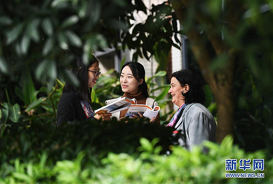 賽勒瑪·易卜拉欣在位于重慶的四川外國語大學(xué)和學(xué)生一起散步、聊天(10月10日攝)。 新華社記者王全超攝