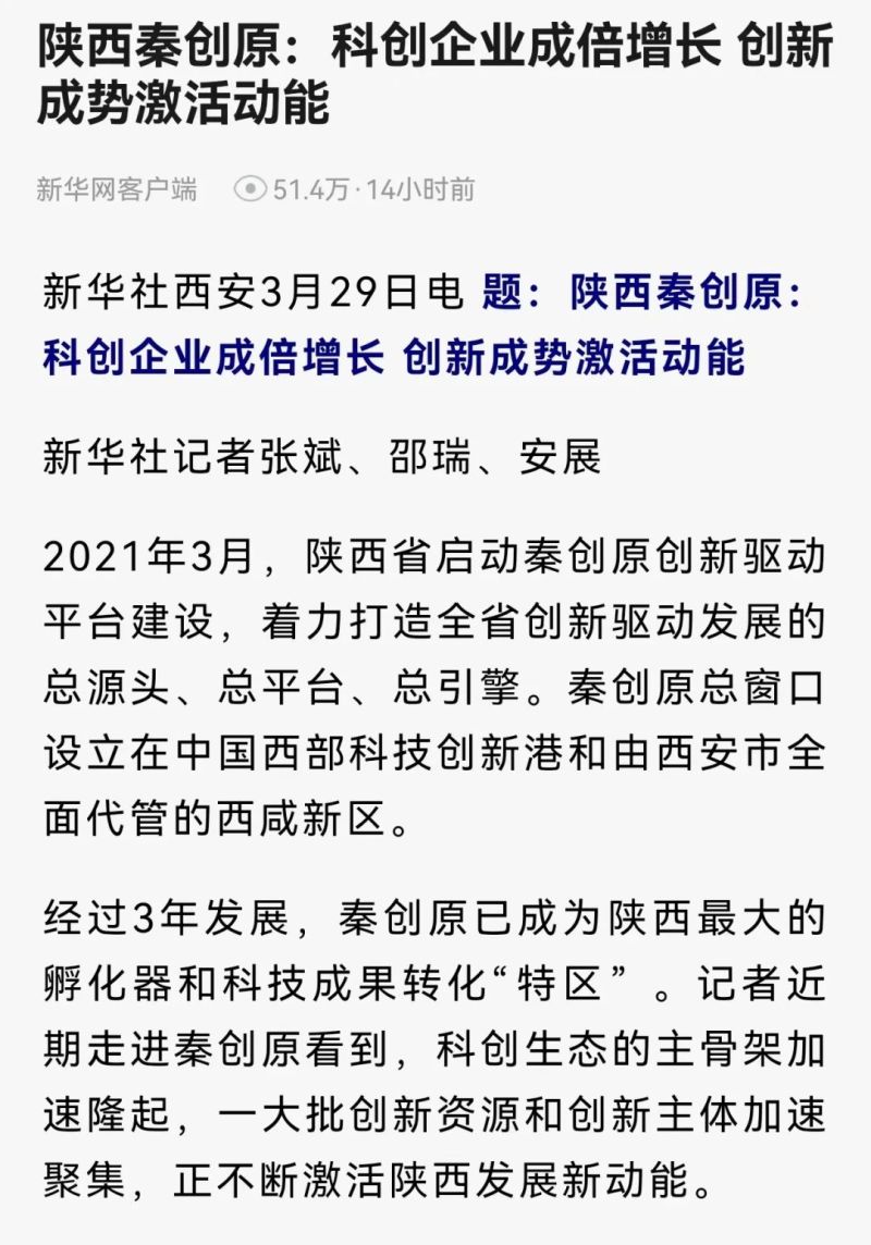 3月29日,新華社刊發電稿《陜西秦創原:科創企業成倍增長創新成勢激活動能》,聚焦秦創原創新驅動平臺建設成效,其中報道西咸新區持續深化“三項改革”,構建全領域、全鏈條、全要素科技創新體系推動新質生產力培育壯大,全文如下。
