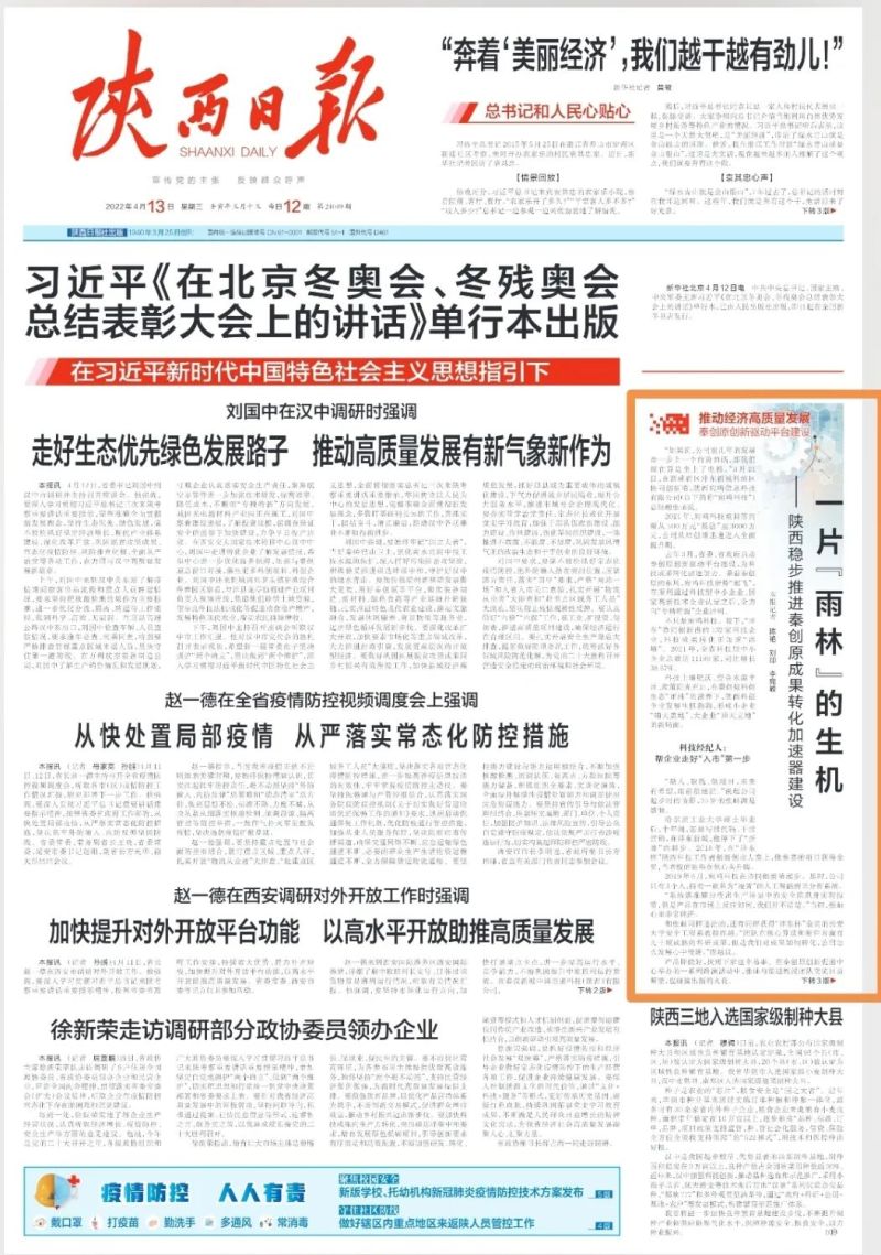 近日,陜西日報頭版刊發《一片“雨林”的生機——陜西穩步推進秦創原成果轉化加速器建設》聚焦西咸新區持續推進秦創原創新驅動平臺總窗口建設,為科技成果轉化加速加力。