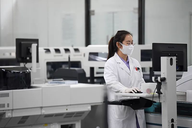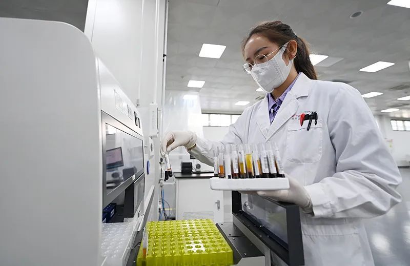 6月17日,在位于秦創原總窗口所在地陜西省西咸新區的西安區域醫學檢驗中心,工作人員將血液樣本加入自動化流水線進行歸檔。