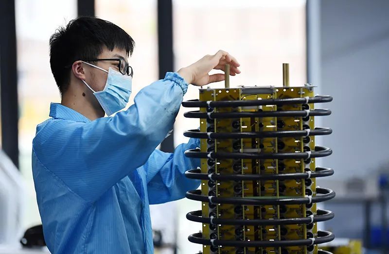 6月17日,在位于秦創原總窗口所在地陜西省西咸新區的西安威思曼高壓電源有限公司,工人在加工制作塔式高壓電源。
