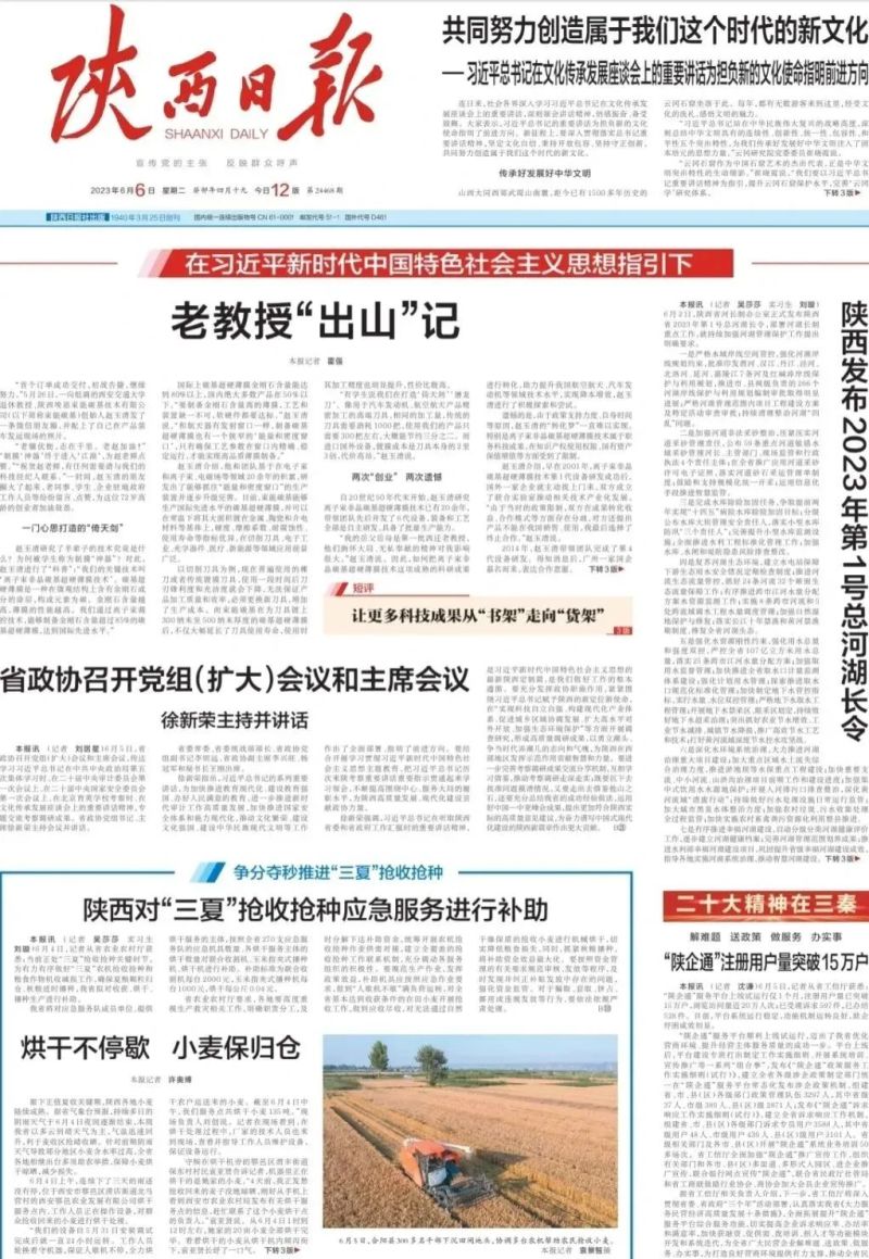 6月6日,陜西日報頭版頭條刊發《老教授“出山”記》,報道72歲老教授在秦創原總窗口的創業故事。