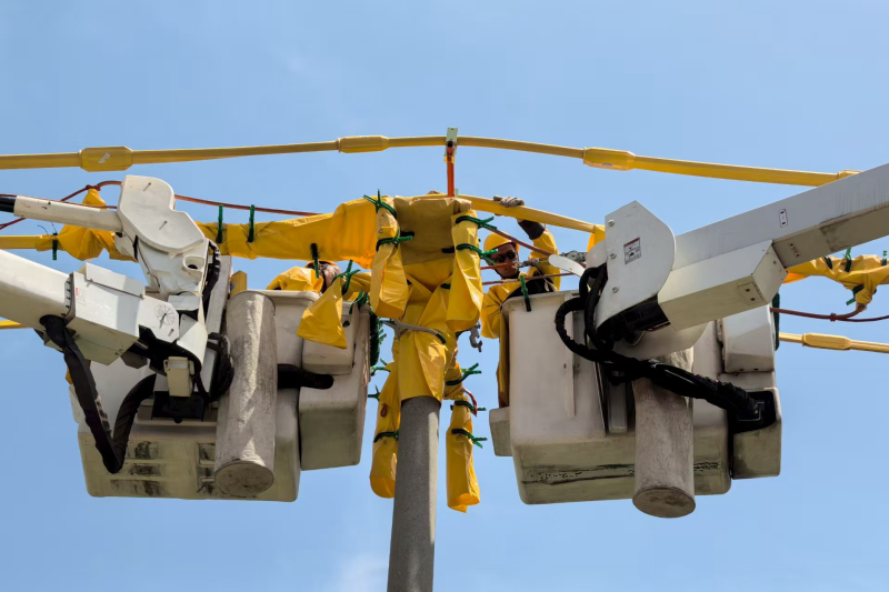 當日,戶外環境溫度已突破40℃。對于帶電作業人員張阿龍和任曉峰而言,這只是“基礎溫度”。當他們按照規程,一層層穿上密不透風的絕緣服、戴上厚重的絕緣手套、套上全密封的絕緣靴后,整個人就如同處于一個“移動的蒸籠”中。