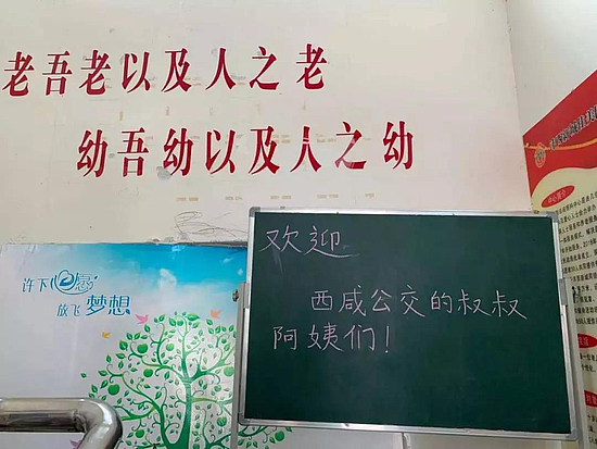 隨后,西咸公交一行在老師的帶領下來到普通教學班,孩子們提前知道志愿者們的到來,在小黑板上手寫了“歡迎西咸公交的叔叔阿姨們”,并且驚心準備了節目:拍手鼓、唱兒歌、手指操......表演節目時孩子們臉上洋溢著快樂的光,愛心志愿者給孩子分發了零食和禮物,共同度過了愉快的一個上午,教室里傳出陣陣歡笑和掌聲。