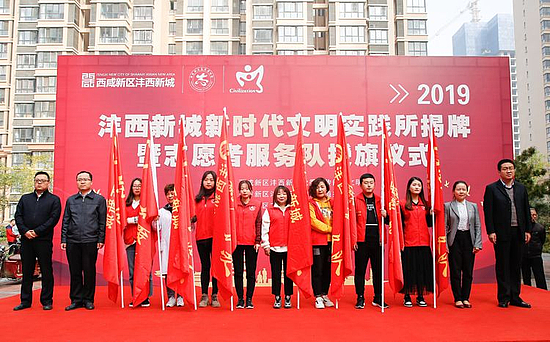 釣臺街道黨工委書記嚴(yán)海嘯,灃西新城黨委宣傳部副部長唐小春共同為釣臺街道新時代文明實踐所揭牌;隨后,灃西新城志愿者代表共同為轄區(qū)志愿者服務(wù)隊進行授旗。