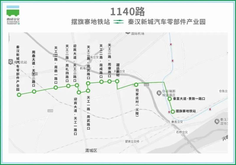 自擺旗寨地鐵站始發(fā),經(jīng)秦直大道、咸宋路、周成路、天工二路至秦漢新城汽車零部件產(chǎn)業(yè)園。