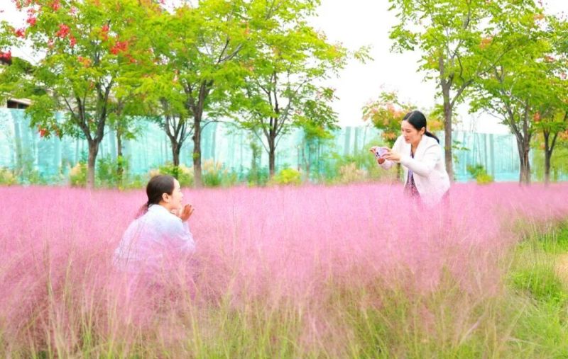 眼下昆明池的粉黛亂子草,正處在最佳觀賞期,花期將延續到11月中旬。在這里,花海不是單一扎堆的“粉色塊”,而是散在園區各個浪漫角落:絲婚雕塑旁藏著細膩柔情,留仙棧邊飄著朦朧仙氣,百草花坡更是連片粉霧繚繞,風一吹,粉穗就和湖面波光一起晃動,連空氣里都裹著甜蜜感。