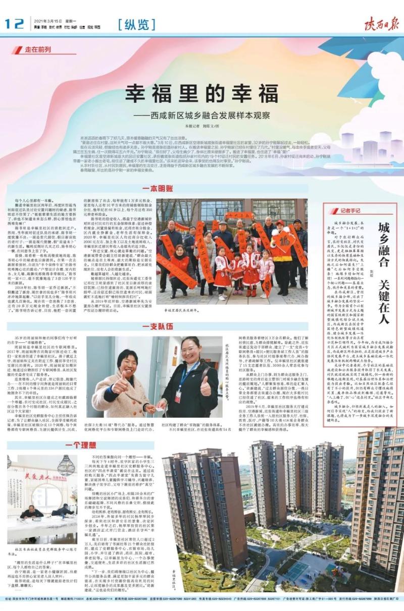 今天,陜西日報整版刊發《幸福里的幸福——西咸新區城鄉融合發展樣本觀察》,聚焦新區致力打造辦事便捷、交通便利、生活多彩的社區生活圈,持續提升公共服務品質,滿足更加豐富多元的需求,讓群眾過上幸福生活。