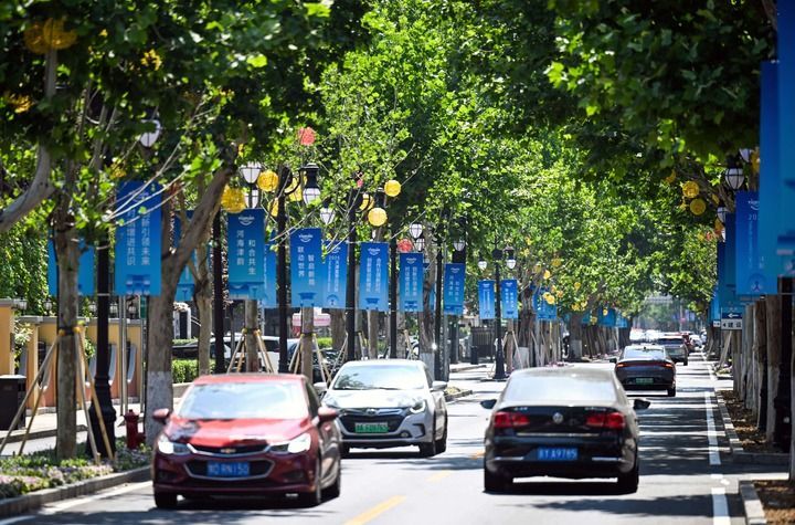 在天津市和平區(qū)泰安道,道路兩旁的路燈上懸掛著2025夏季達(dá)沃斯論壇宣傳標(biāo)語(yǔ)(6月21日攝)。