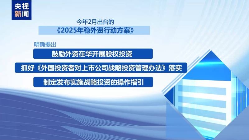 今年2月出臺的《2025年穩外資行動方案》明確提出:鼓勵外資在華開展股權投資,抓好《外國投資者對上市公司戰略投資管理辦法落實》,制定發布實施戰略投資的操作指引,還提出取消外商投資公司使用境內貸款限制、鼓勵外國投資者投資設立投資性公司、便利外國投資者在華實施并購投資等。