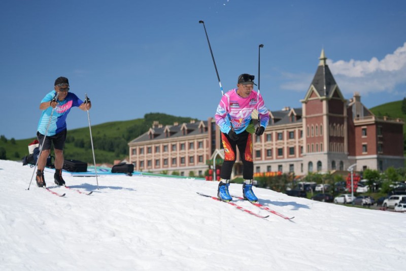 7月11日,兩名滑雪愛好者在內蒙古牙克石市鳳凰山景區的雪道滑雪。當日,內蒙古呼倫貝爾市牙克石市鳳凰山景區啟幕雪夏歡樂季活動。當地利用去年冬季儲存的積雪,在景區內鋪就一條雪道,以季節反差為游客營造出獨特的冰雪運動體驗。新華社記者 馬金瑞 攝