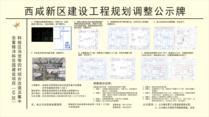 根據西安市自然資源和規劃局《關于加強建設工程規劃條件核實管理工作的通知》,現將科統區馮黨等四村綜合改造及集中安置樓灃科花園建設項目(C區)規劃許可內容調整予以公示。批前公示并非最終審批結果,在公示期內,利害關系人若有意見,可來電向西咸新區自然資源和規劃局(灃東)工作部、開發建設部反映。