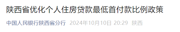 為貫徹落實黨中央、國務院決策部署,支持城鄉居民剛性和改善性住房需求,促進房地產市場平穩健康發展,根據《中國人民銀行 國家金融監督管理總局關于優化個人住房貸款最低首付款比例政策的通知》要求和因城施策原則,結合陜西省各地市城市政府調控意愿,經陜西省市場利率定價自律機制會議審議通過,自2024年10月10日起,陜西省各城市商業性個人住房貸款不再區分首套、二套住房,最低首付款比例統一為不低于15%。