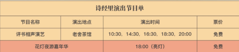 為回饋廣大游客的大力支持,即日起詩經(jīng)里國風潮尚嘉年華活動內(nèi)容調(diào)整,免費邀請游客入園賞盛世花燈,聽評書相聲,詳情請關注“詩經(jīng)里小鎮(zhèn)”微信公眾號及“詩經(jīng)里小鎮(zhèn)”官方微博。活動時間為2月26日至3月10日10:00-21:00。