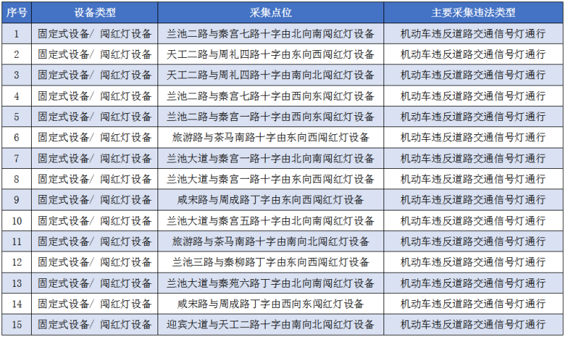 為進(jìn)一步加強(qiáng)西咸新區(qū)重點(diǎn)道路交通管理,優(yōu)化道路通行環(huán)境,預(yù)防和減少道路交通事故發(fā)生,保障廣大人民群眾的生命財(cái)產(chǎn)安全,根據(jù)《中華人民共和國道路交通安全法》《中華人民共和國道路交通安全法實(shí)施條例》等法律法規(guī)的有關(guān)規(guī)定,結(jié)合西咸轄區(qū)道路交通實(shí)際,現(xiàn)決定自2024年9月19日零時(shí)起正式啟用以下23處違法抓拍取證設(shè)備,現(xiàn)將新增道路交通違法采集點(diǎn)位公示如下: