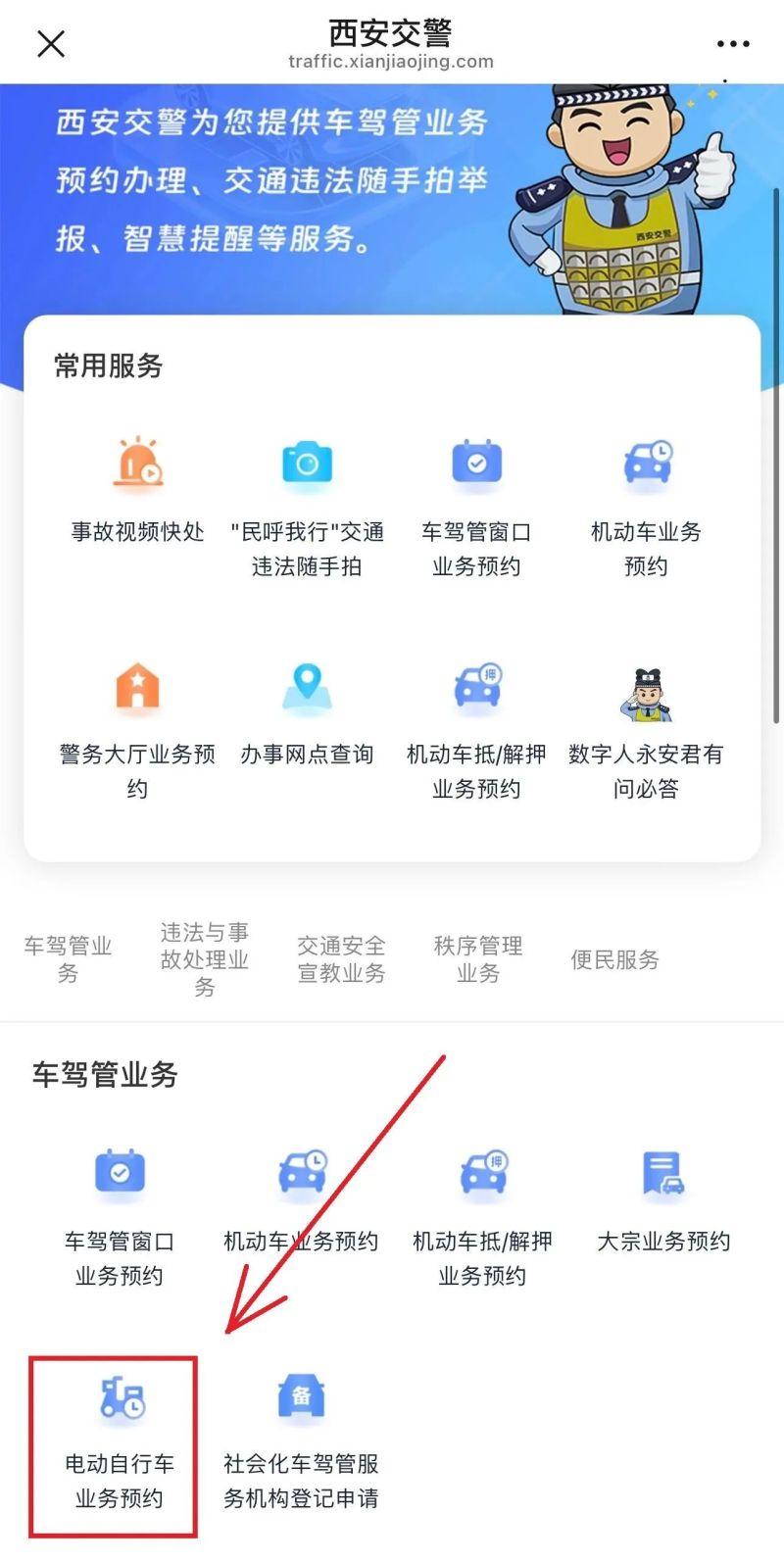 第一步:關注“西安交警”微信公眾號,點擊“業務辦理”,隨后點擊“電動自行車業務預約”,按照流程填寫相關信息,選擇合適的掛牌地點進行預約。