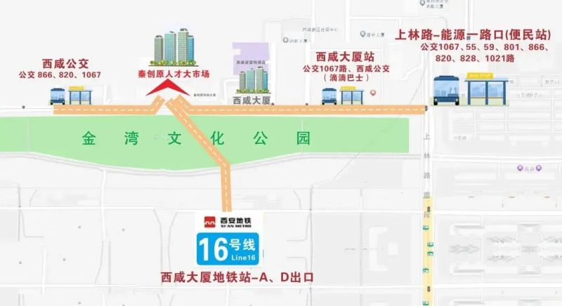 方式一:西安地鐵16號線“西咸大廈”站A/D口出,步行至“西咸大廈”樓宇西側100米即到。