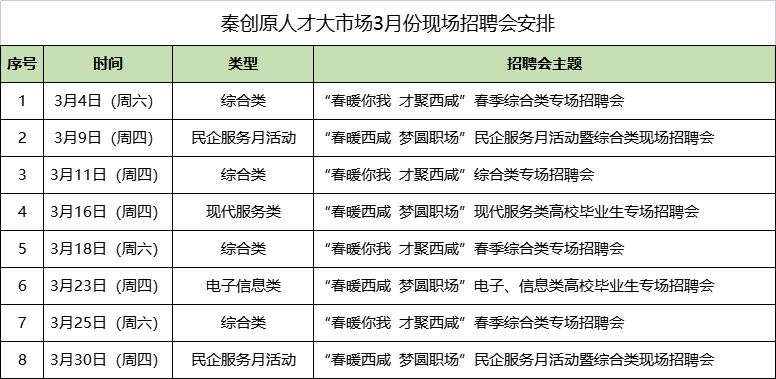為進一步做好穩(wěn)就業(yè)工作,服務(wù)企業(yè)人才需求促進群眾家門口就業(yè),秦創(chuàng)原人才大市場還將在3月份舉辦多場專題招聘會,歡迎大家積極報名參與。