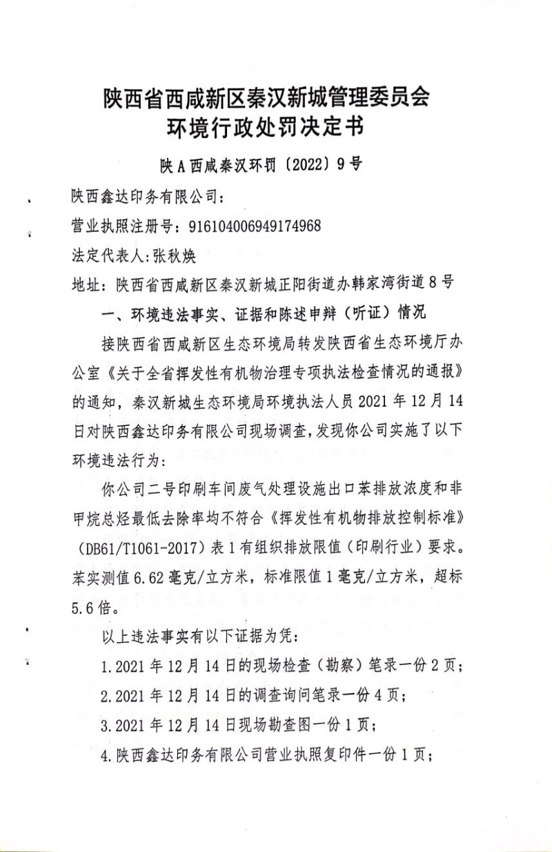 陜西鑫達印務有限公司環境行政處罰決定書和責令改正環境違法行為決定書
