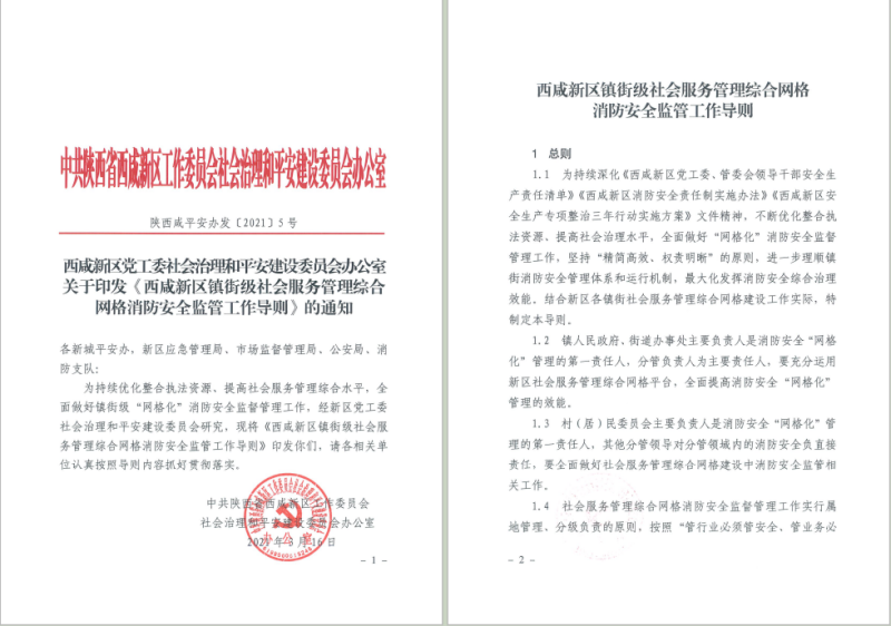 為持續優化提升社會服務管理綜合水平,全面做好鎮街級“網格化”消防安全監督管理工作,西咸新區堅持“精簡高效、權責明晰”的原則,制定出臺了《鎮街級社會服務管理綜合網格消防安全監管工作導則》。